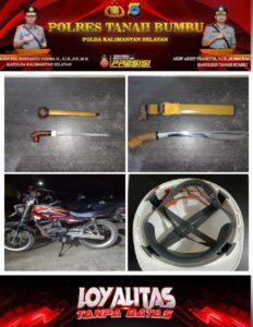 Dalam penangkapan tersebut, polisi turut mengamankan sejumlah barang bukti berupa satu buah helm warna putih yang terdapat bercak darah, satu lembar surat Visum Et Repertum, satu bilah senjata tajam jenis parang sepanjang 49 cm lengkap dengan kumpang warna kuning, satu bilah senjata tajam jenis keris sepanjang 29 cm lengkap dengan kumpang warna cokelat, serta satu unit sepeda motor Yamaha RX King warna merah dengan nomor polisi DA 3882 CT.
